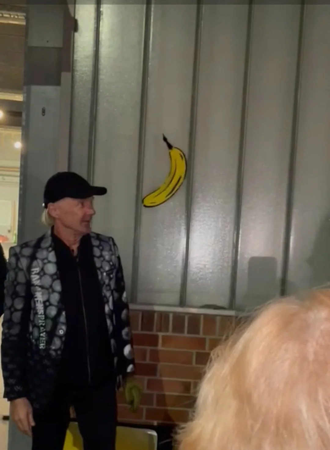 Thomas Baumgärtel sprühte bei der Vernissage seine Banane an die Wand und ich habe für die Ausstellung einen schweren Holzblock in der Form des typischen Bananenaufklebers von Chiquita bearbeitet.